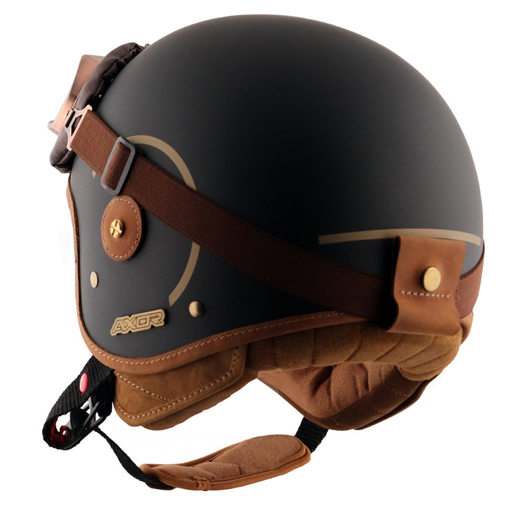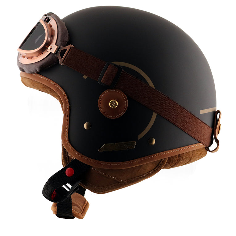Che - A black helmet with a brown leather border and a pair of classy metallic copper goggles known as Ruin (copper-colored frame with dark shades).