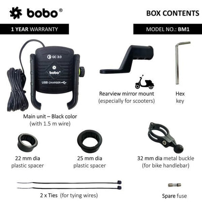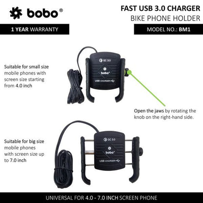 BOBO BM1 Jaw-Grip Bike Phone Holder (with fast USB 3.0 charger) Motorcycle Mobile Mount