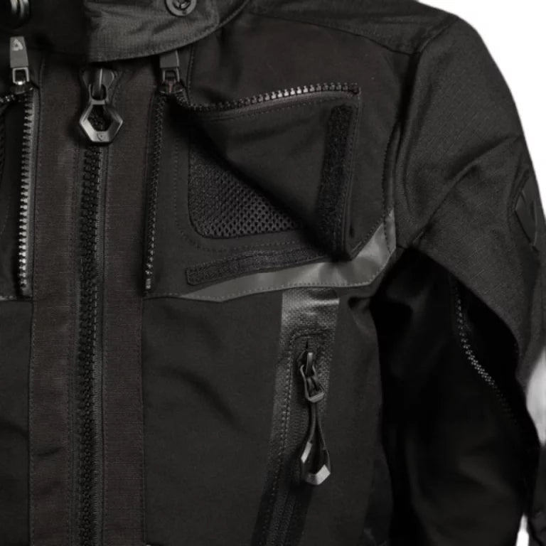 The all black design gives the jacket a sleek, technical, and premium appearance suited for touring, adventure riding, and cross country travel.
