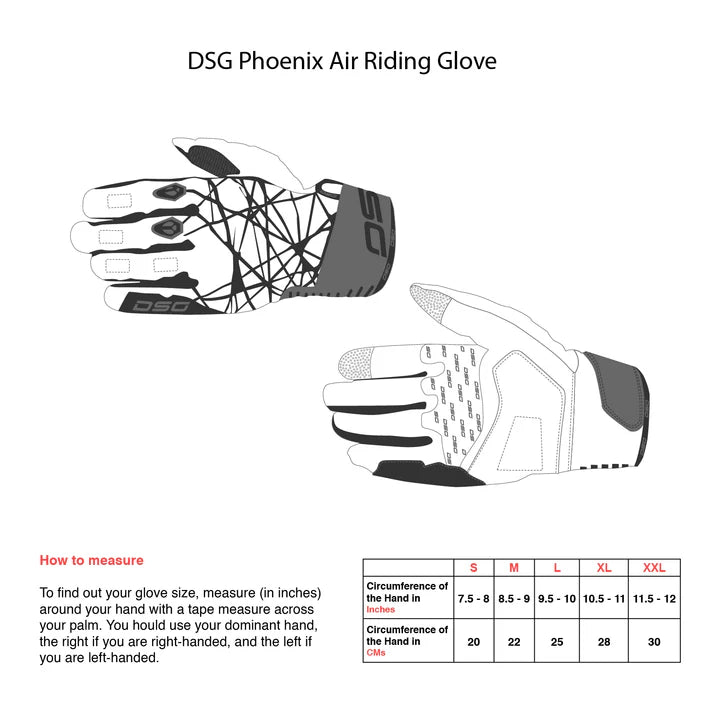 Introducing the entry-level DSG Phoenix air gloves. Though “entry-level", it is loaded with great protection features and then wrapped in a stylish design. You’ll find laminated reflection at the back of the hand, our shield technology at the palm, an EVA foam palm slider, a visco-elastic knuckle and more. Furthermore, a host of colour options lets you mix and match the Phoenix gloves with your preferred riding gear.