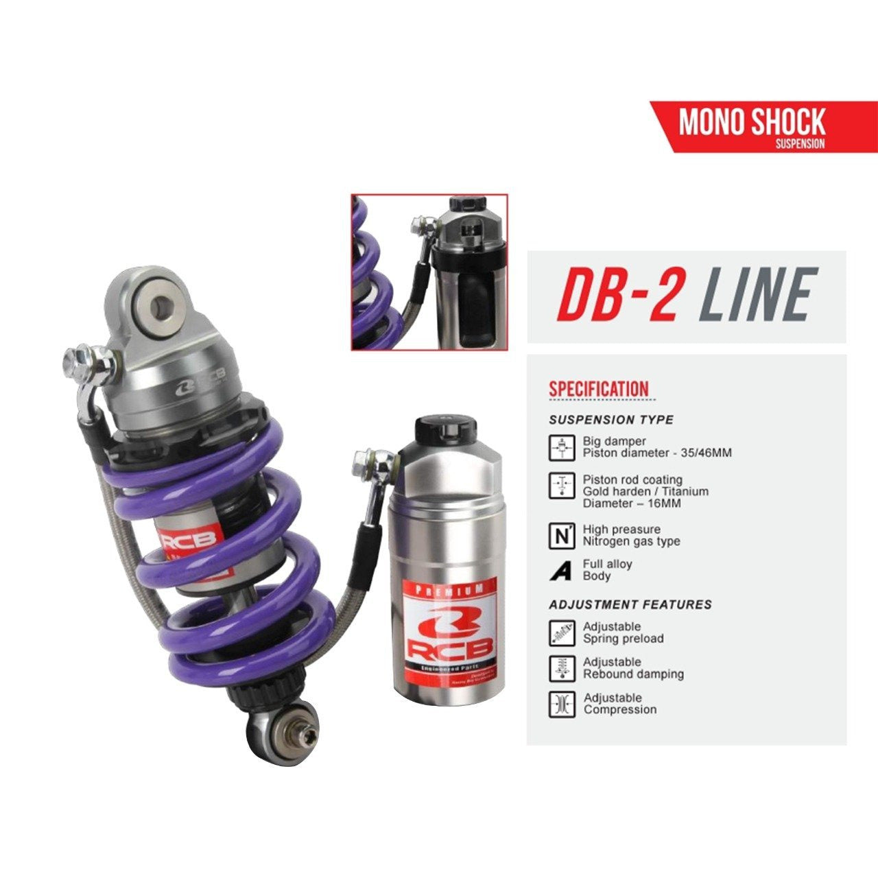 14 mm piston design (Racing Boy Mono Shock series) for improved damping stability.