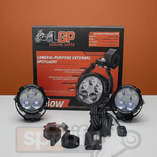The LGP DK550 Pro High Power Spotlight is a 90W LED auxiliary light designed for universal fit on motorcycles and cars, featuring dual white and yellow light colors for versatile use in different conditions.