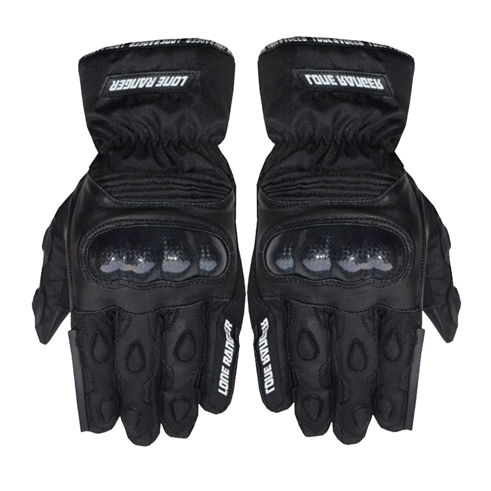 â— A lightweight textile and leather construction. â— Hipora membrane to make the gloves waterproof. â— TPU Molded carbon fiber finish knuckle protection. â— Velcro cuff closure. â— Reinforced palm. â— Index finger and Thumb for ease of mobile usage without moving gloves. â— Clear vision wipers are provided on the index finger of the left hand for quick and easy removal of water and mud drops on the visor. â— Comfort lining. â— Rubber insertion on the palm. â— Pre-curved finger structure for a better fit. â— The anti-slip mechanism on the palm. â— Lone Ranger Branding. â— These are waterproof riding gloves easy to use in removing and wearing the gloves. â— Waterproof winter gloves can be cleaned easily and provide good fit and comfort.