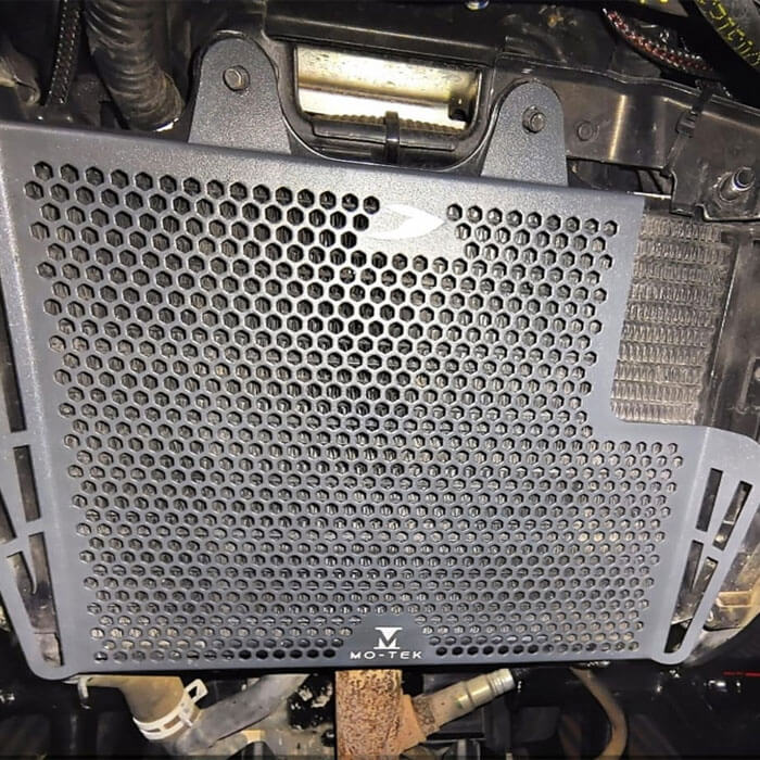 MOTEK'S savvy design means our radiator guards are secured in place using original mounting points on the bike. No cable ties in sight. This is down to the advanced design by people who understand the concept of function, ease of fitting and aesthetics. The elegantly designed matrix is pierced with hexagonal holes to optimize airflow whilst providing maximum protection from road debris. The BAJAJ DOMINOR radiator guards boast remarkable strength to weight ratio, typically weighing 240 grams. Easy to follow Instructions and fixings are supplied with every radiator guard. As only the best will do for BAJAJ DOMINOR riders, the guard is CNC machined from aircraft quality aluminum. The BAJAJ DOMINOR radiator guard is finished in durable black powder coating. CLINICALLY CUT TO ACCOMODATE THE EXISTING HORNS AT THE SAME POSITION Motorcycle radiator protection has never looked as good!