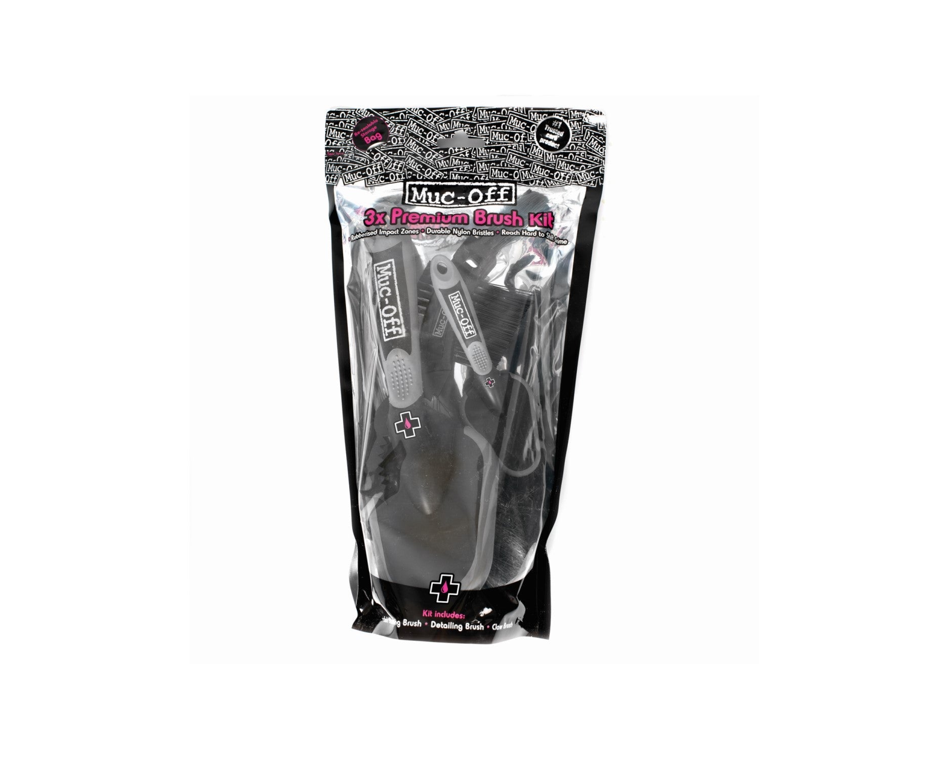 - Take your bike cleaning regime to the next level with Muc-Off’s versatile, quality and great value 3 Premium Brush Kit. It’s ideal for agitating dirt while caring for your bike’s delicate finish. The set contains a Soft Washing Brush, a Detailing Brush & a Claw Brush.