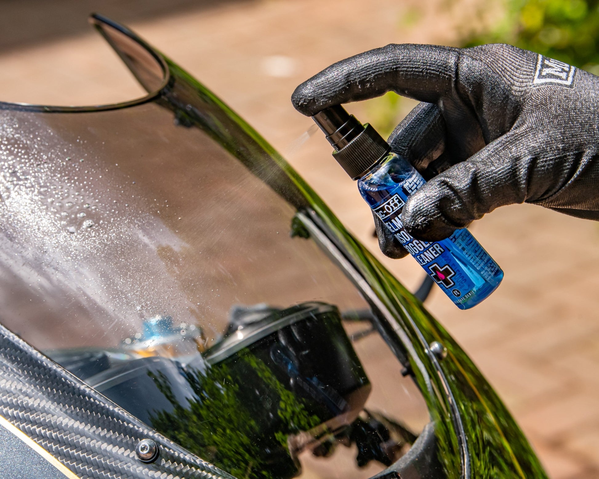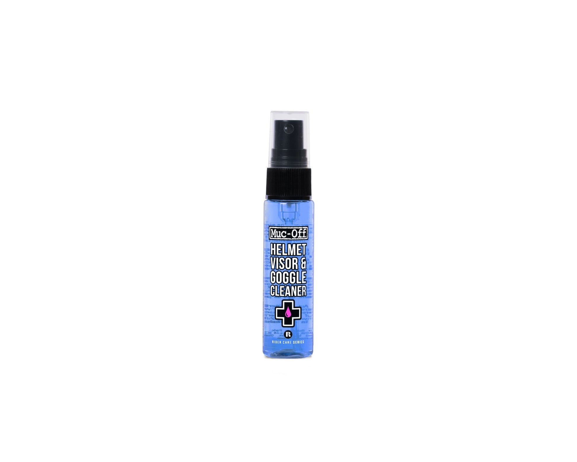 - Muc-Off’s Helmet, Visor & Goggle Cleaner quickly and safely removes dirt, dust, grime, snow, sweat and oily residue from all helmets, eye wear and goggles. Its been formulated using de-ionized water as recommended by many helmet manufacturers and it’s safe to use on all lens materials including polycarbonate! It gets rid of smudges and streaks on your visor and googles, giving you crystal clear vision when shredding and getting filthy. Visor, Lens & Goggle Cleaner is also anti-bacterial and uses pH neutral soaps.