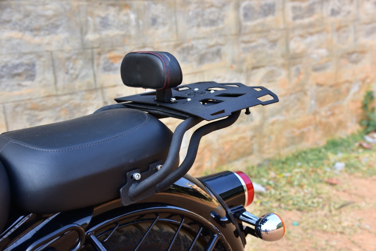 A carrier plate can be mounted on the top of the existing rear racks for long-distance travelling. It helps in carrying additional luggage on your ride. So, going for a long ride can be now made comfortable by carrying whatever we want. It’s that simple to mount luggage and go the distance with our specially designed carrier for Himalayan . With an efficient back rack, mounting your luggage becomes easy and effortless. This back rack is simple to install and remove with its easy to install design. The product featured here is made with mild steel and powder coated for rust resistance.