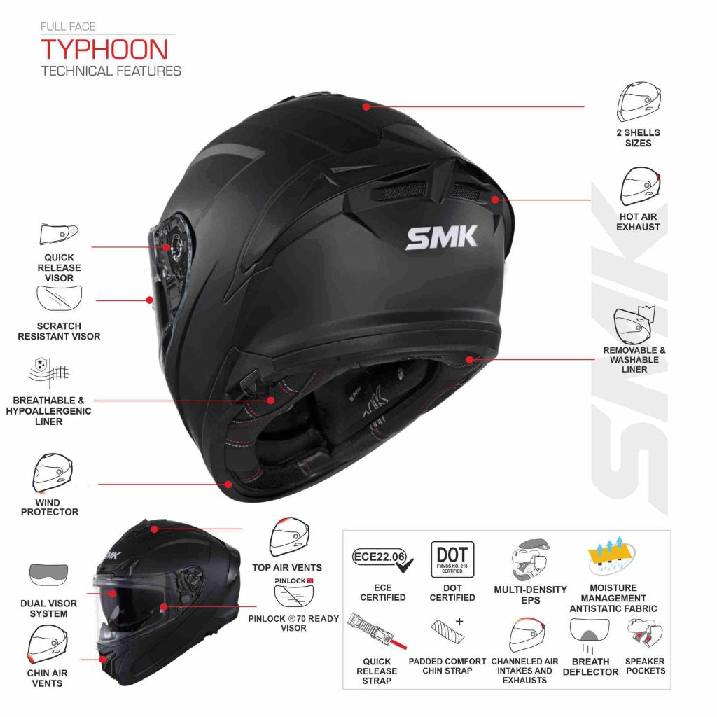 TYPHOON SOLID is a Full-face helmet with a compact and aerodynamic shell design that appeals to sports tourers and daily commuters. The Typhoon range of helmets from SMK comes with industry-leading safety and comfort features. Enhanced with amazing graphics and solid colors, it gives you the option to pick one that matches your lifestyle!